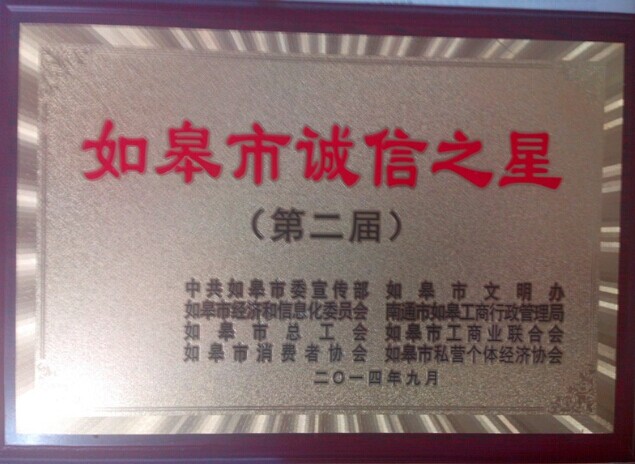 根據(jù)《如皋市企業(yè)誠信之星評(píng)定方法》,經(jīng)如皋市工商局與市委宣傳部、文明辦、經(jīng)信委、總工會(huì)、工商聯(lián)、消協(xié)、私個(gè)協(xié)等八部門局等相關(guān)政府部門查核,我公司連續(xù)五年堅(jiān)持誠信為本、操守為重,符合《如皋市企業(yè)誠信之星認(rèn)定標(biāo)準(zhǔn)》,在社會(huì)上享有良好聲譽(yù)!